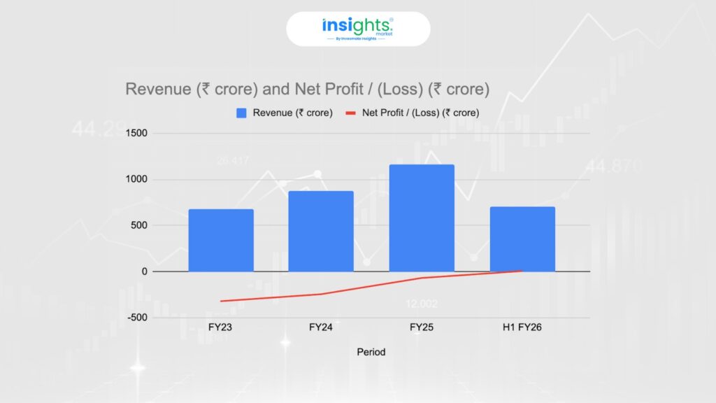 Amagi has delivered a strong revenue growth trajectory, recording ~30% CAGR from FY23 to FY25. Revenue increased from ₹680.56 crore in FY23, when the company reported a net loss of ₹321 crore. In FY24, revenue rose to ₹879.15 crore, while losses narrowed to ₹245 crore, reflecting a ~24% year-on-year reduction. FY25 saw further scale-up, with revenue reaching ₹1,162.64 crore and net losses compressing sharply to ₹68.7 crore. The turnaround became visible in H1FY26, with ₹704.82 crore revenue generated in six months and a net profit of ₹6 crore.