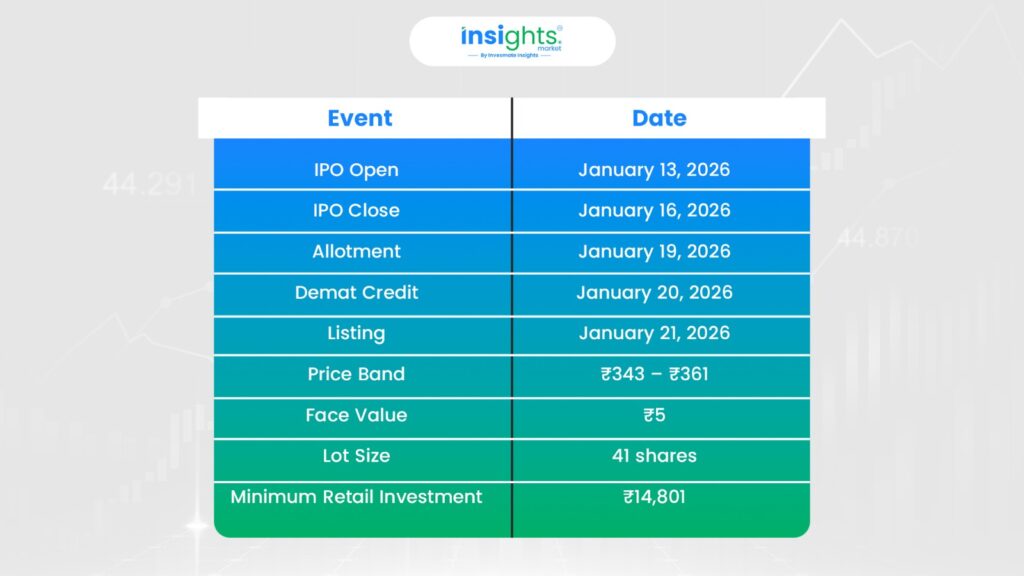 The IPO price band is fixed at ₹343–₹361 per share. Retail investors must apply for a minimum of 1 lot (41 shares), translating to a minimum investment of ₹14,801 at the upper price band.