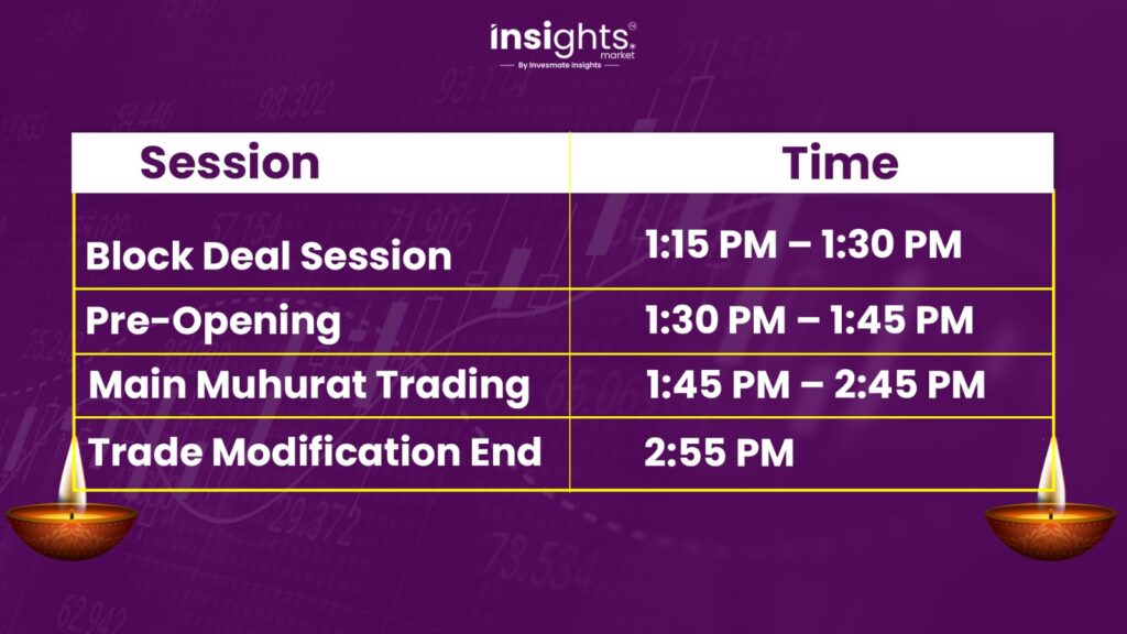 Muhurat Trading 2025 will take place on Diwali day, featuring a one-hour main session along with a short pre-open and a post-session modification window. The exact timings are announced each year through official exchange circulars, so investors should check the notice a few days before Diwali.