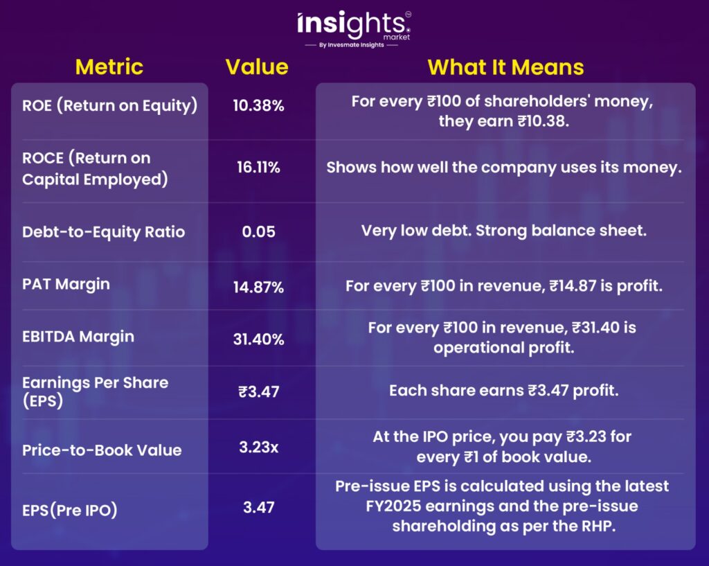 The financials highlight that FY2025 was a turnaround year, marked by a clear recovery in both growth and profitability after a slowdown in FY2024. Revenue rose from ₹200.7 crores in FY2024 to ₹248.8 crores in FY2025, reflecting a 17.65% increase, while EBITDA improved from ₹55 crores to ₹73.26 crores, lifting margins from 27.72% to 31.40%. Net profit also strengthened sharply from ₹12.75 crores to ₹34.69 crores, with the PAT margin expanding from 6.43% to 14.87%.