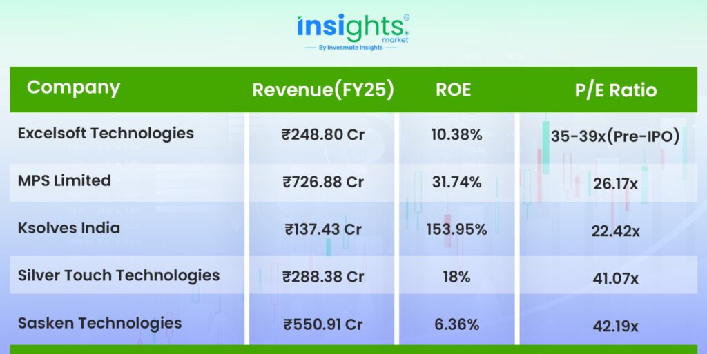 Excelsoft’s revenue is smaller than most peers except Ksolves, and its ROE sits mid-range in the group. Its Pre-IPO PE of ~39x is above MPS and Ksolves but below higher-valued peers like Silver Touch and Sasken, placing it in a moderately priced zone.