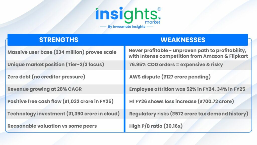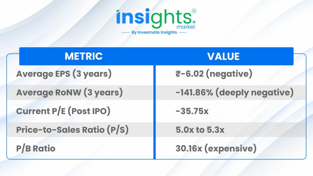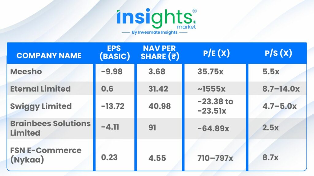 Among its peers, Meesho trades at a comparatively lower P/S multiple of 5.0x–5.3x, versus Zomato at 9.3x and Nykaa at 8.6x, making it cheaper on a sales-multiple basis. However, its negative EPS and deeply negative RoNW show that profitability is still a challenge, especially compared to profitable peers like Eternal or high-growth leaders like Nykaa. Overall, the valuation discount suggests the market is pricing in Meesho’s losses—but whether it becomes an attractive value ultimately depends on confidence in Meesho’s path to sustainable profitability.