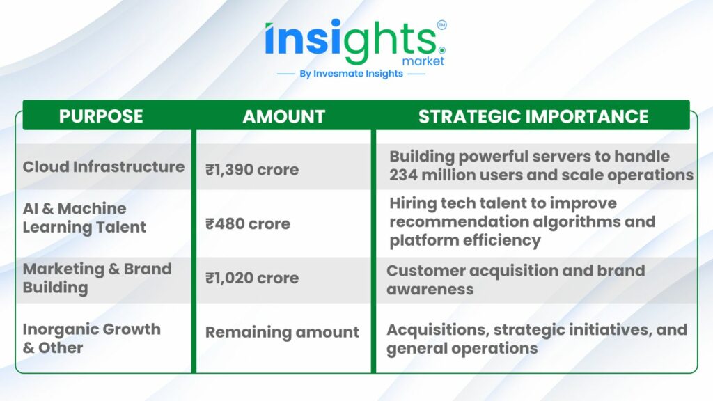 Meesho plans to utilize the ₹4,250 crore fresh issue proceeds mainly to strengthen its technology and growth initiatives. About ₹1,390 crore will go toward cloud infrastructure, ₹480 crore for expanding its AI and machine learning talent, and ₹1,020 crore for marketing and brand-building efforts. The remaining funds will be used for inorganic growth opportunities and general corporate purposes. This allocation shows a focus on long-term sustainability and technology-driven expansion.