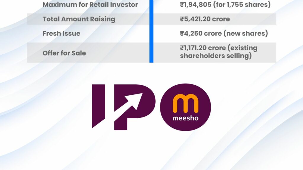 Meesho is raising a total of ₹5,421.20 crore through its IPO. This includes a fresh issue of ₹4,250 crore, where new shares are being created, and an offer for sale (OFS) of ₹1,171.20 crore, where existing shareholders are selling their shares. In total, the IPO consists of around 38.29 crore fresh issue shares and 10.55 crore OFS shares.
