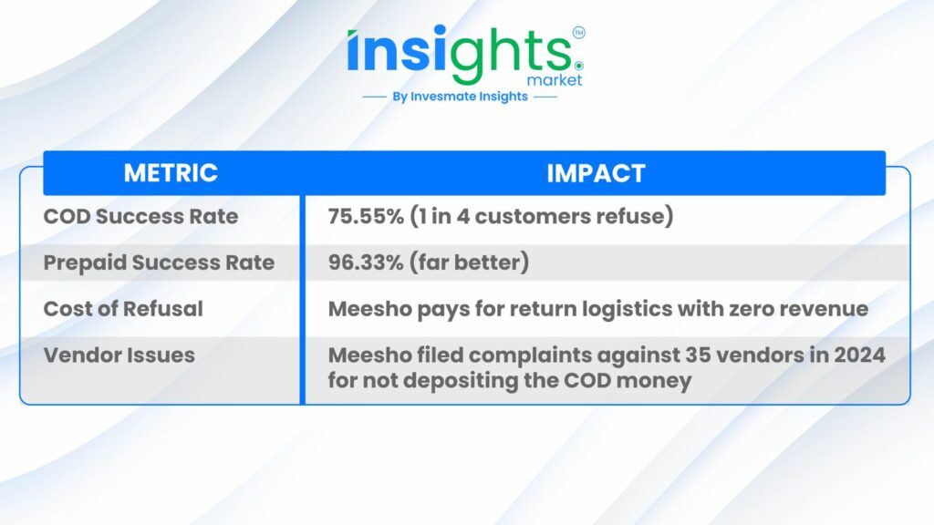 When customers refuse COD orders, Meesho absorbs both forward and reverse delivery costs—essentially losing money on that transaction. This directly eats into margins.