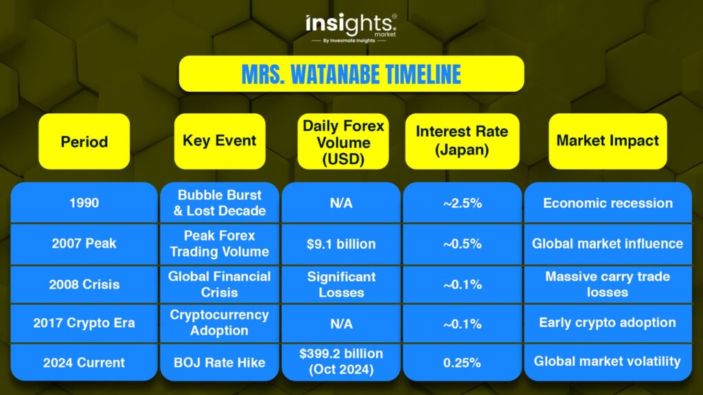 A: In July 2024, the Bank of Japan raised interest rates to 0.25% for the first time in 17 years. This seemingly small change triggered massive unwinding of yen carry trades globally. The estimated $4 trillion global carry trade began collapsing. In early August 2024, global markets crashed as traders closed positions, with the Nikkei falling over 12% in a single day. Mrs. Watanabe was back in headlines as decades of trades unwound.