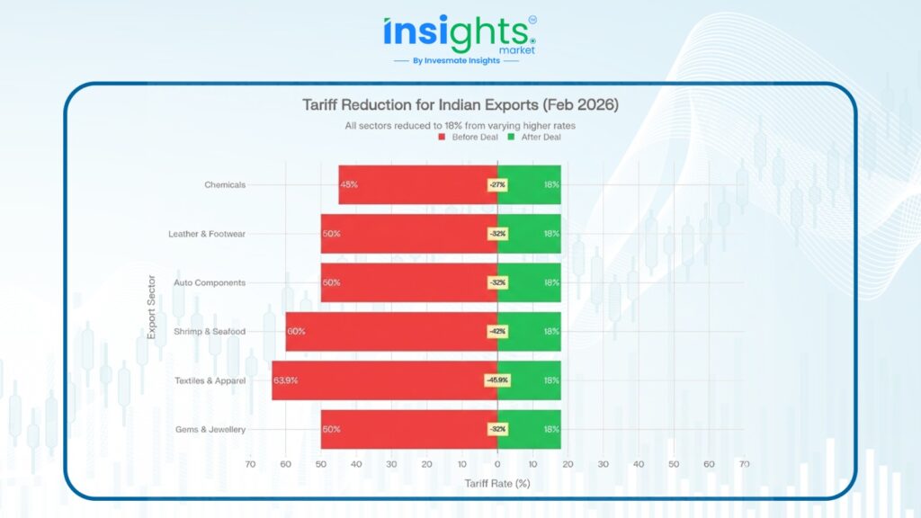 Textiles and apparel ($10.8 billion exports) face the largest tariff relief at 45.9 percentage points, followed by gems & jewellery ($10 billion), shrimp/seafood ($2.4 billion), and auto components ($3 billion). Pharmaceuticals remain exempt from tariffs but benefit from uncertainty removal. Export-oriented sectors with 50%+ US revenue exposure stand to see the most immediate earnings expansion.